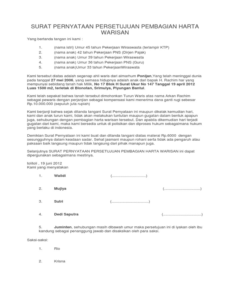 Surat Pernyataan Persetujuan Pembagian Harta Warisan Ahli Waris Alm Pdf