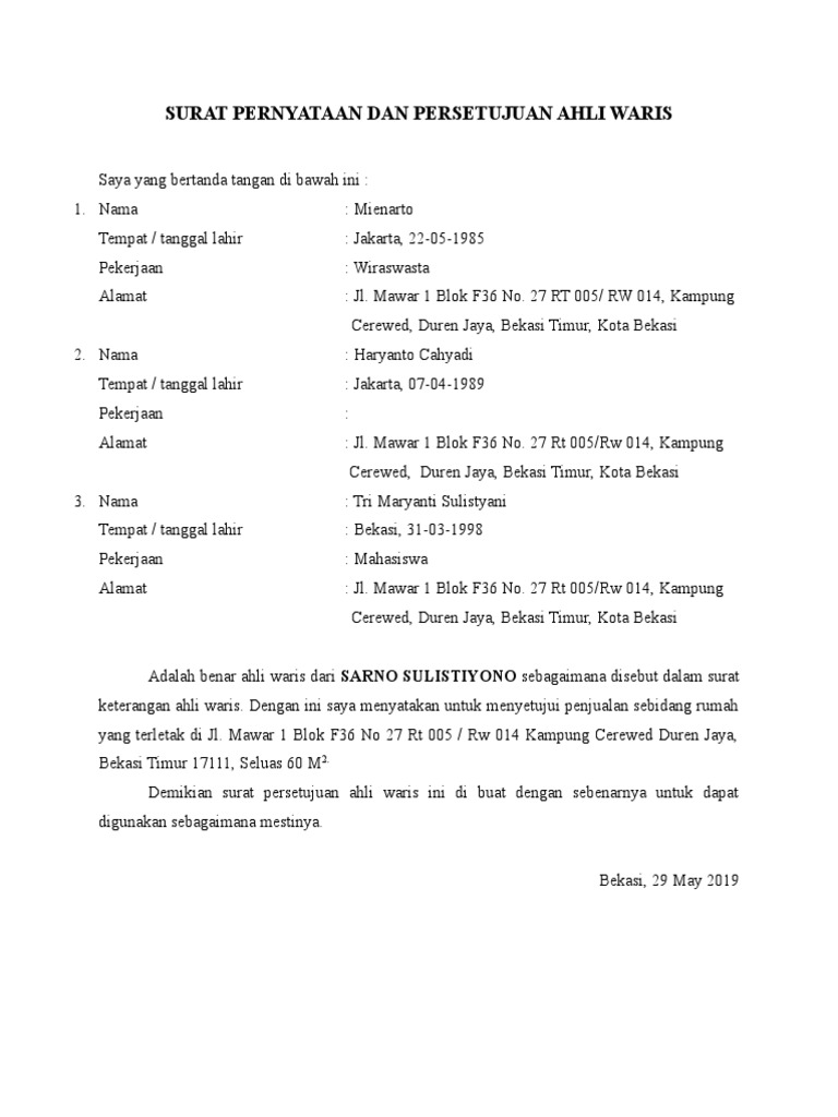 Pewaris harus berusia 21 tahun atau sudah menikah. Contoh surat persetujuan ahli waris. Luas tanah - Luas tanah keseluruhan yang telah diukur oleh Pihak XXX dan disaksikan oleh 3 orang ahli waris dan pemilik tanah yang berbatasan dengan tanah tersebut adalah 289 m2.